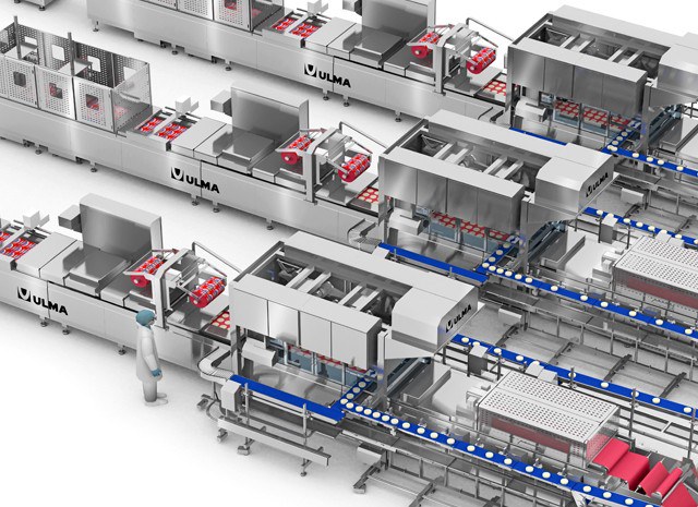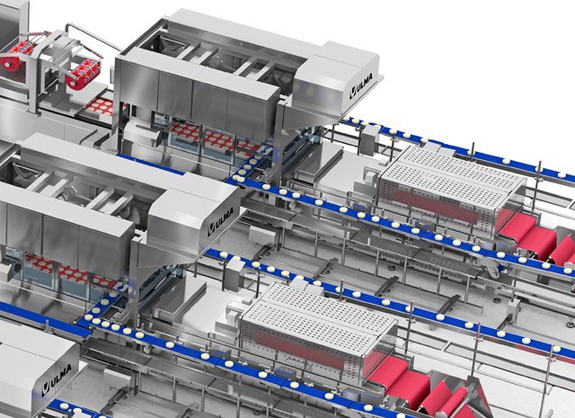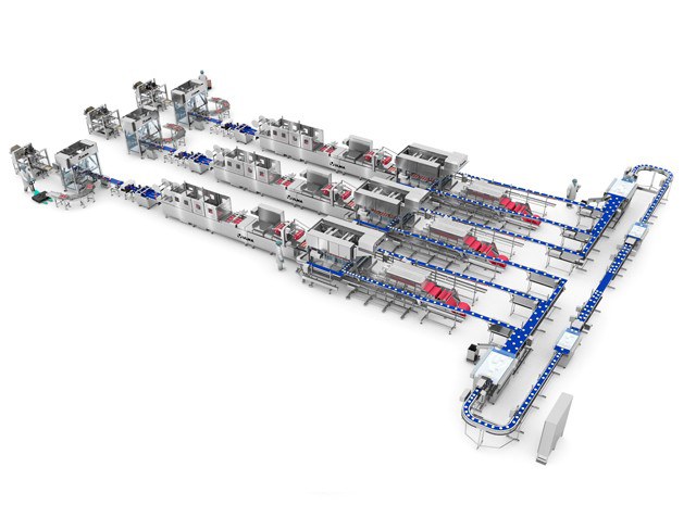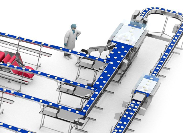 By means of a conveyor system specially adapted for fresh product that facilitate the cleaning tasks, the product flow is divied into two areas that distribute the product in a balanced way towards the thermoformers.