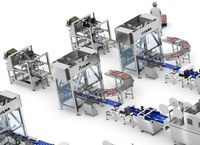 The aligner is place just after the thermoforming machine and converts the three package rows into a single one so that they can later be inspected by the metal detector arranged just before the case packer.
