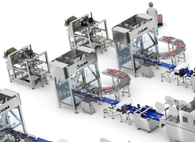 Each of the three lines has a case erector that forms the carton boxes with the stacked the carton sheets. The robotized case packing cell is responsible for introducing the thermoformed packages in the boxes, arranging them according to the required mosaic for the packages.