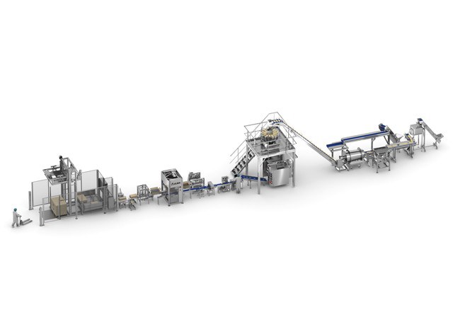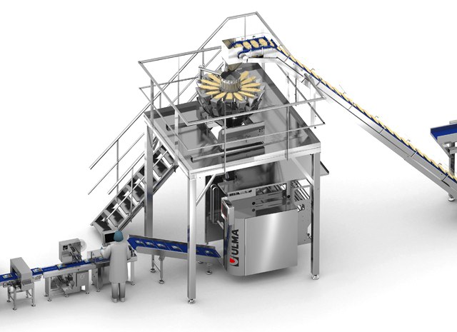 The product rises to the multi-head combination weigher that makes the necessary doses for each bag, transferring the product to the vertical packaging machine.
