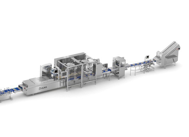 The line starts with an automatic slicer that is equipped with a product accumulation buffe to supply the robotic loading cell that consists of two robots that feed the thermoformer.