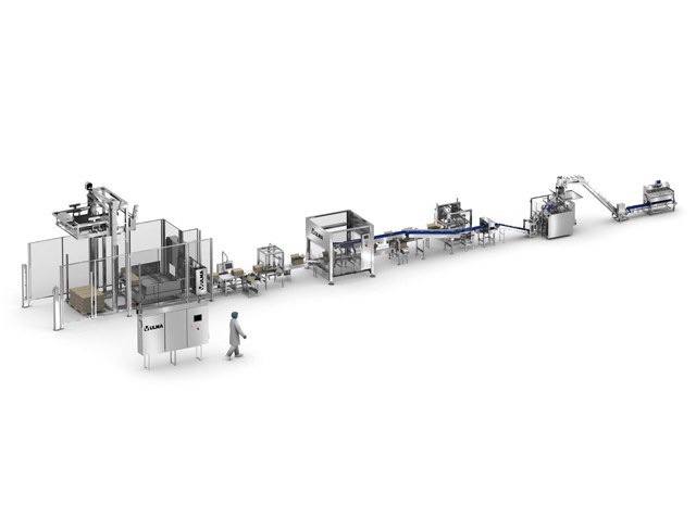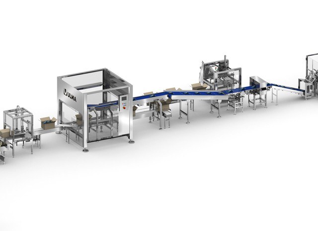 The line consists of case erector for carton boxes, robotized case packing cell and box closing system. All perfectly integrated into the line so that the process is fully automatic.