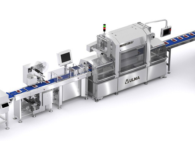 ULMA' s TSA automatic and hygienic design traysealer seals the trays of meat fillets in a controlled atmosphere (MAP) to increase their shelf life. It has an automatic tray denester that feeds the trays to the infeed belt.