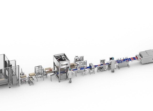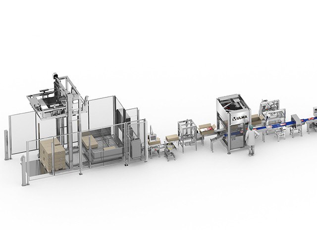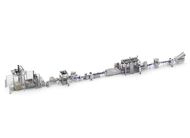 Complete automated packaging line for sliced meat products.