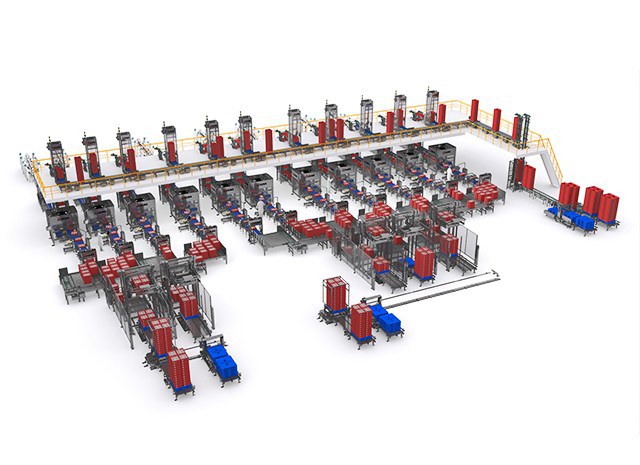 The facility receives complete pallets of plastic crates that are empty and clean. These pallets are depalletized and the crates are transported in columns to the upper floor using a crate column lift.