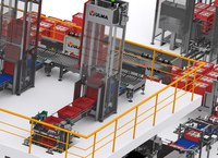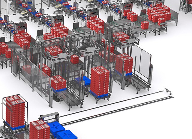 After the case packaging cells, the full crates are stacked and palletized using mechanical palletizers. Crate stacking prior to palletizing increases the efficiency of the palletizing system by improving the proportion of palletized crates per palletizer movement.