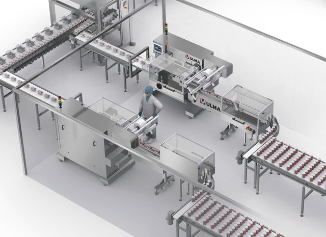 The case packing area is formed by a case erector that provides the carton boxes to the boxing cell.