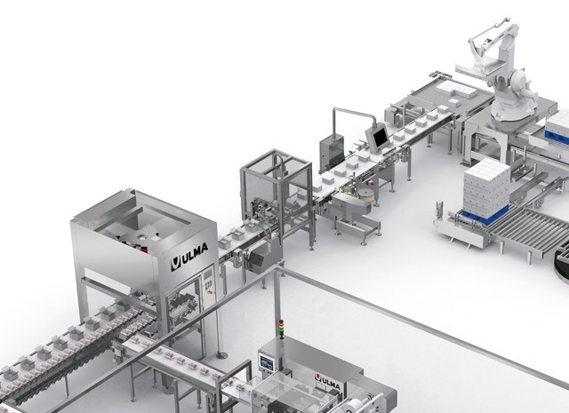 This case packing cell consists of a robot that collects the flow wrapped packages from the two lines and inserts them into the carton boxes.