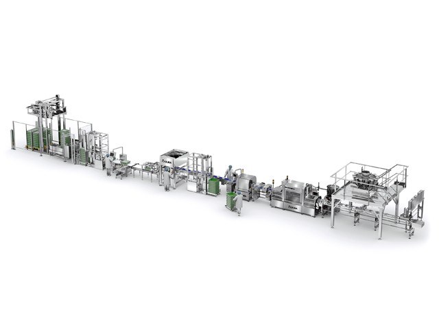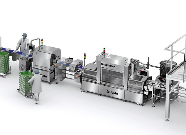 The line begins with a tray denester that has a stack of trays to feed the cadence required by the traysealer.