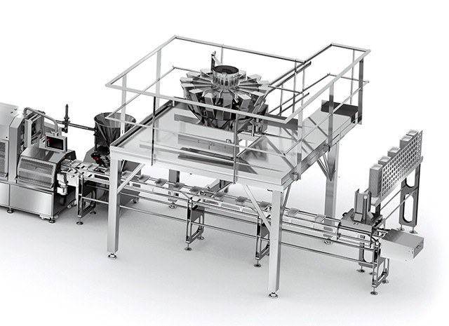 The multi-head weigher loads the product into the trays so that later a dosing system provides de sauce to the product in continuous motion.