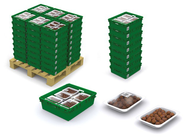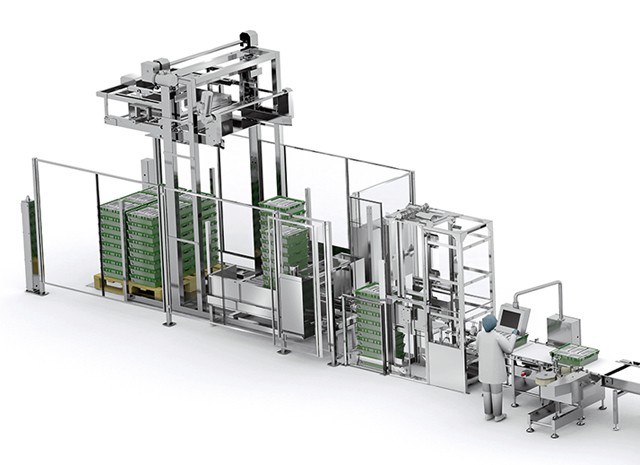 The robotized case packing cell loads the plastic crates with the traysealed packages so that immediately and automatically the bar of the crate is closed in order to be stacked.