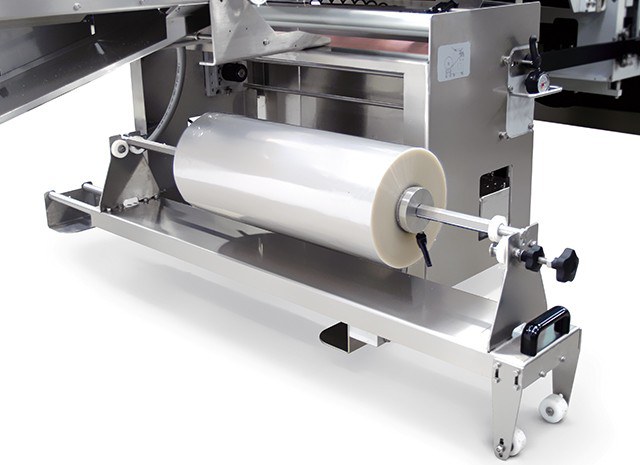 - Easy access reel holder that simplifies the loading of heavy rolls. It is equipped with a motorized film unwinding system for optimum machine operation.