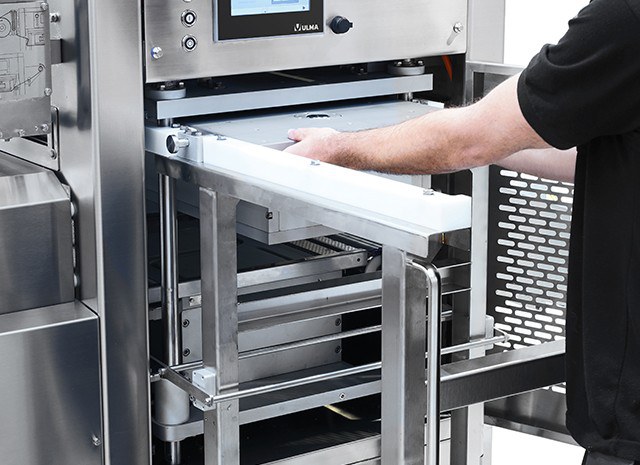 Trays are automatically transported via rod-bars in the entry conveyor to the sealing station, sealed, gas flushed and then passed to an exit belt.