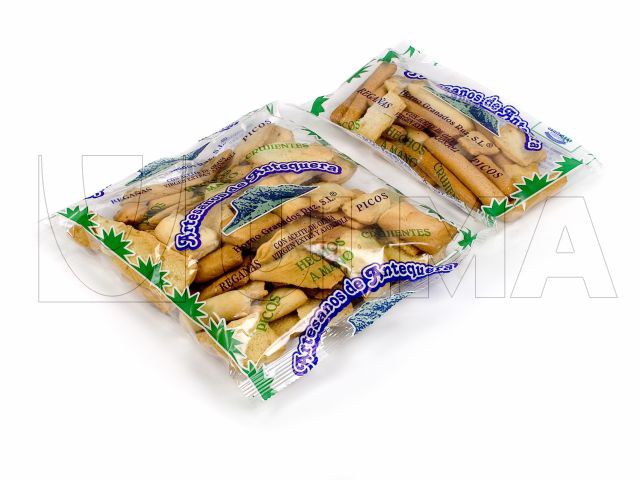 Bread snacks packaging in vertical machine (VFFS) in pillow pack. 45º inclined machine version for fragile products. 1177_1.jpg VTI 200 Vertical packaging machine (VFFS) which makes a three sealing pack. Medium production speed performance up to 70 cycles/min. with an excellent quality/price ratio.