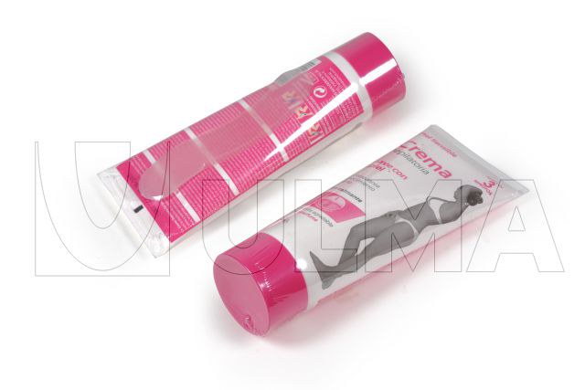 Packaging and shrinking of depilatory cream container with plastic spatula with polyolephine film Packaging that guarantees the inviolability of the container cap and the spatula with an excellent presentation. 1547_1.jpg SC 500 Automatic side seal machine for shrink films as well as not shrink films. High performance level.